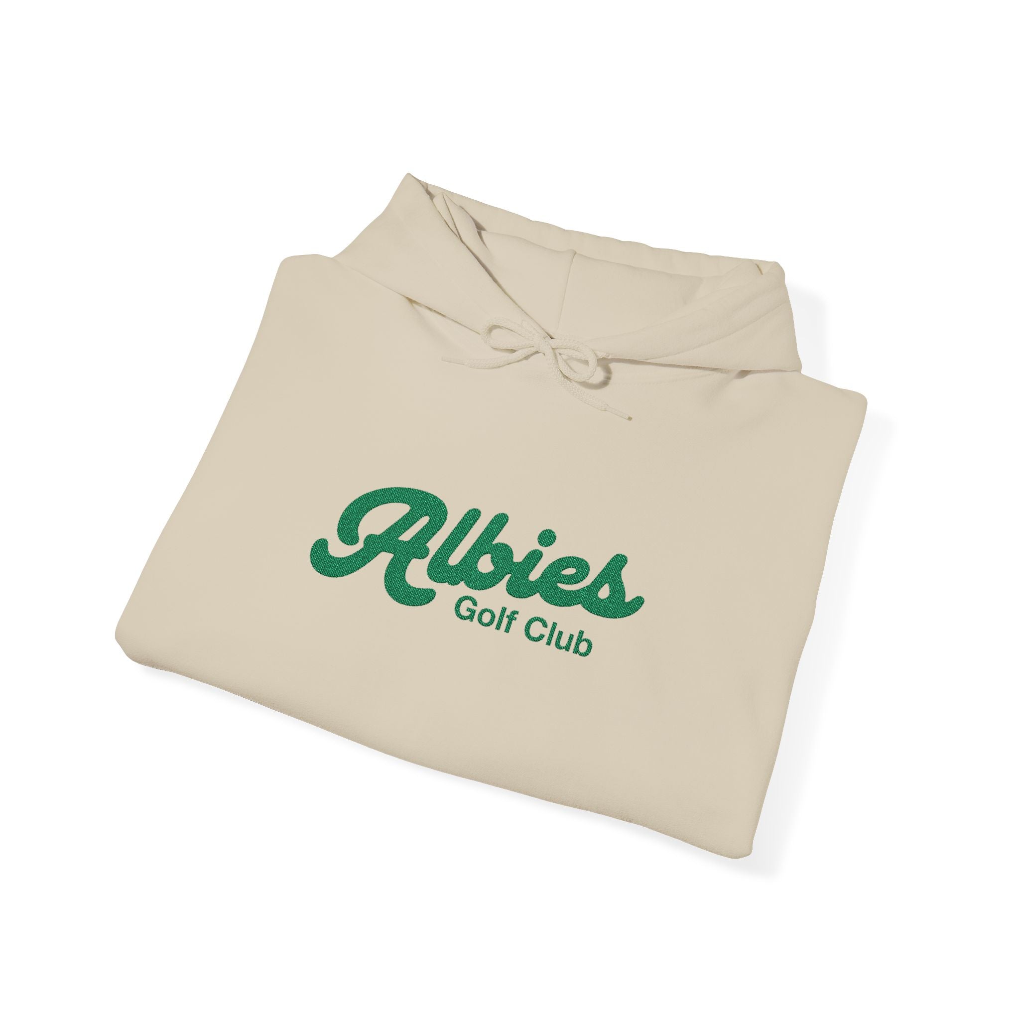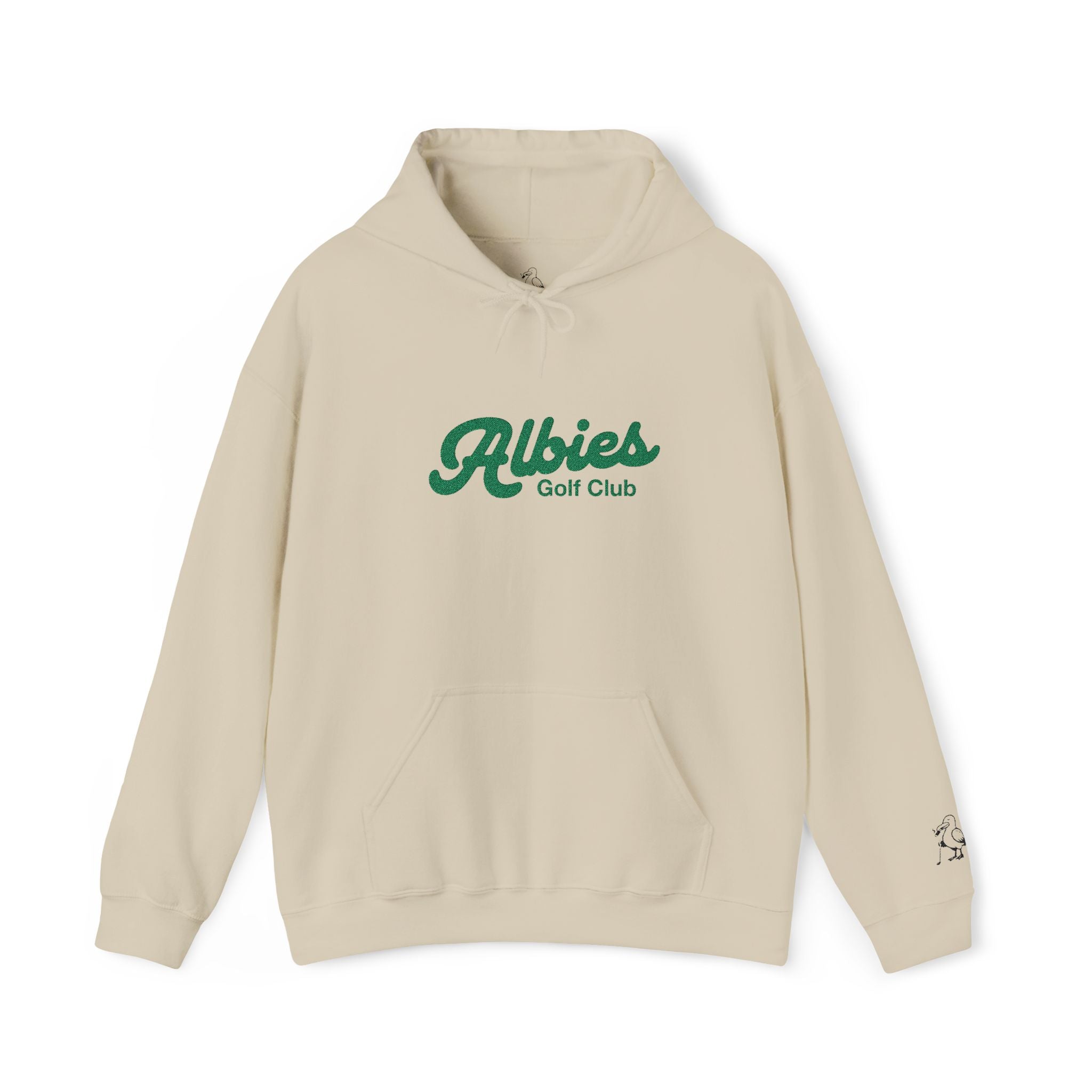 A hoodie built for early tee times and off-duty days. The sand tone stays clean and versatile, while the embroidered green script gives it that familiar, lived-in Albies character. A double-lined hood and matching drawcord keep the silhouette classic, and the kangaroo pocket is there for cold hands, keys, or a travel mug. Finished with subtle wrist embroidery for the people who appreciate details that don’t shout.