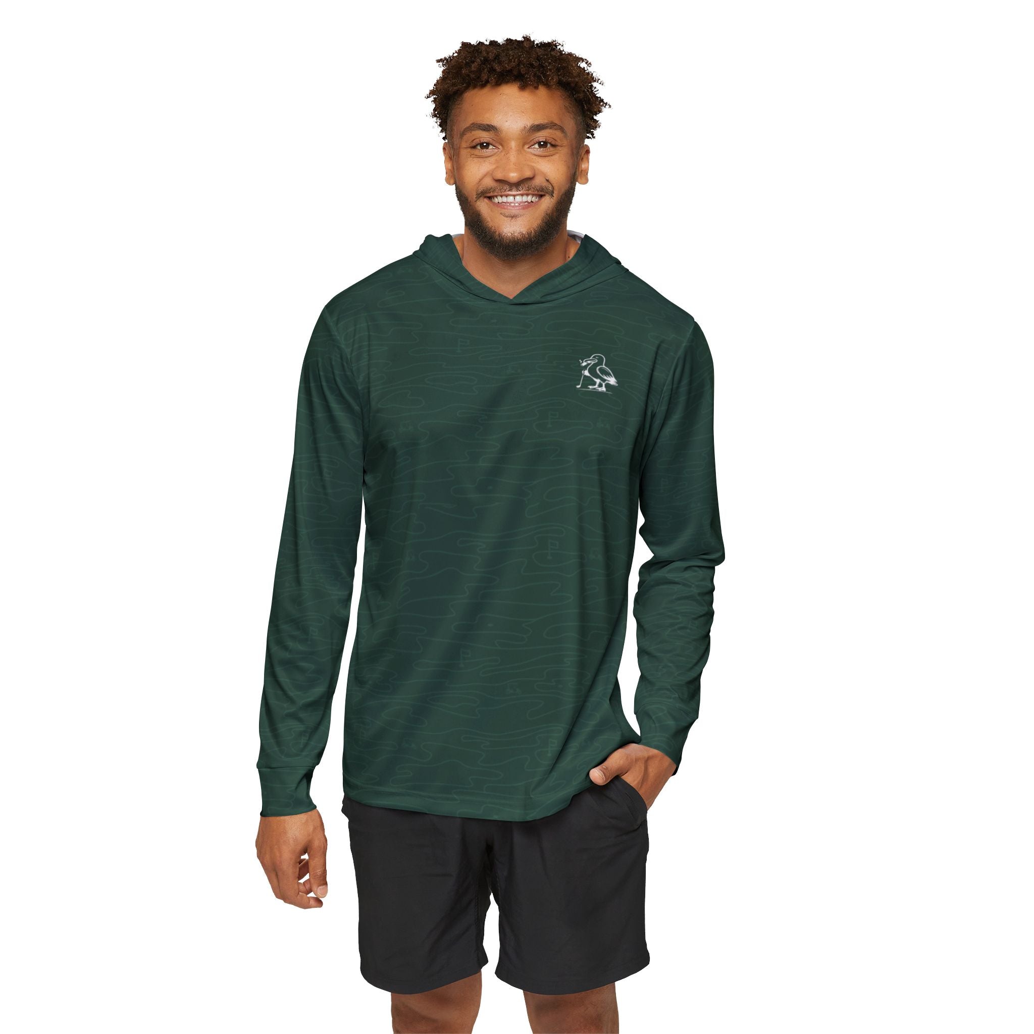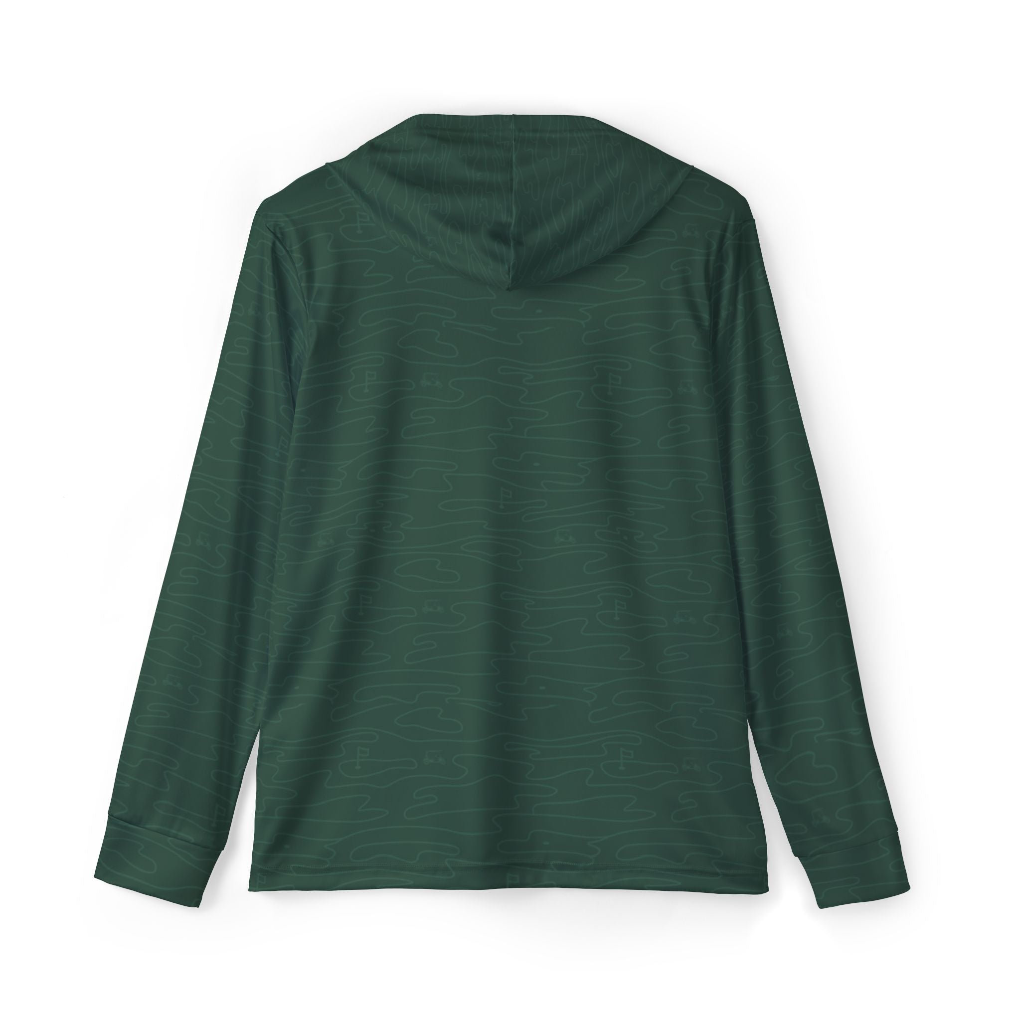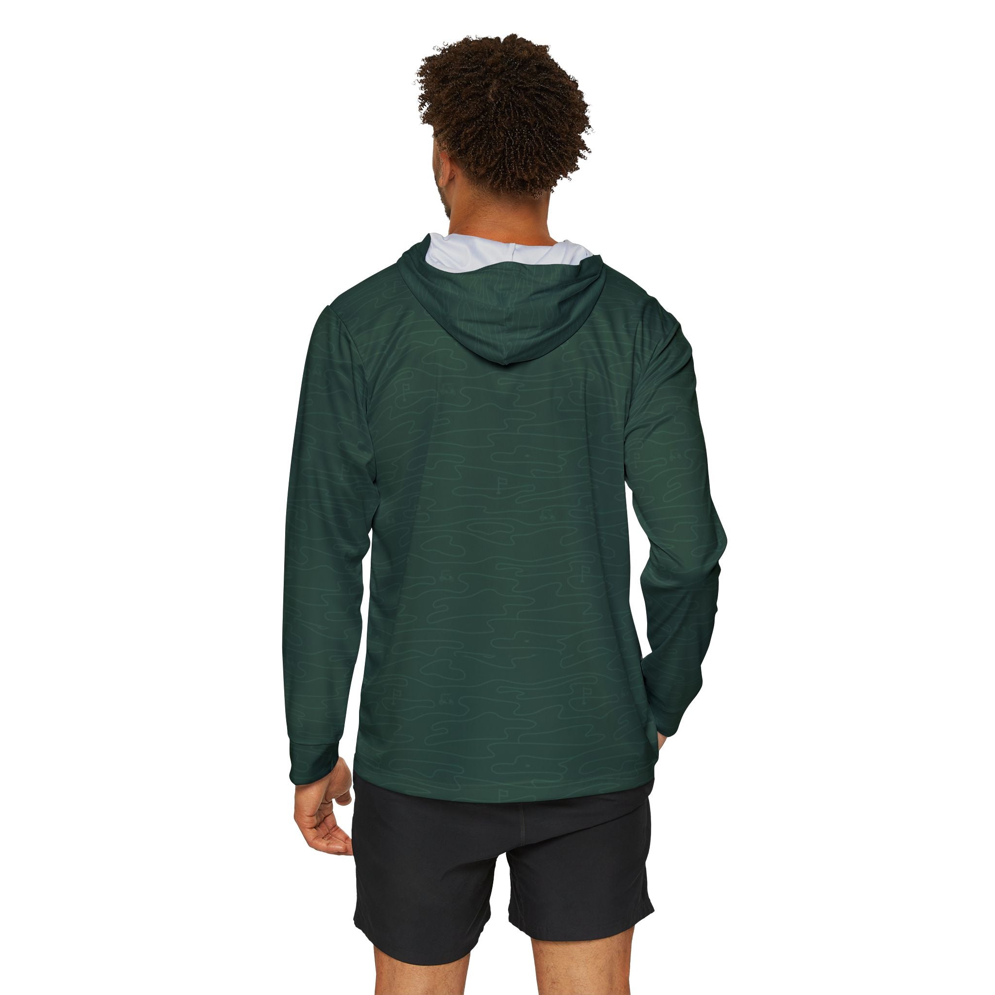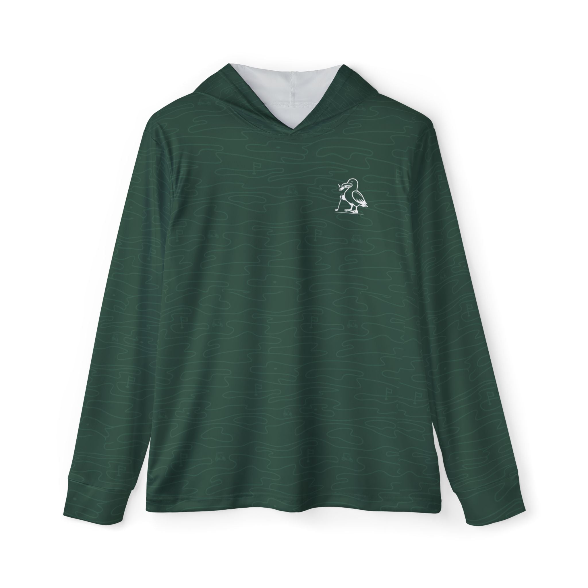 A modern warmup layer with a proper club finish. This lightweight performance hoodie is built from quick-drying, moisture-wicking polyester to stay comfortable through range sessions, travel days, and sunny rounds. The deep green tonal camo keeps it understated, while the crisp white hood lining and small Albies gull mark on the chest add a clean, premium contrast. Extra-light fabric drapes easily for a refined silhouette you can wear on its own or layer without bulk—ideal for early tee times, post-round errands, and anywhere you want athletic function with country club restraint.